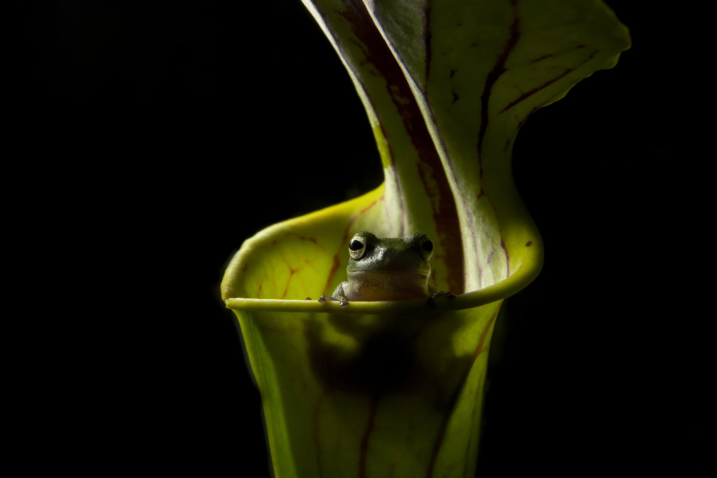 Anytime I am working with a relatively cooperative subject like this, I try to create as many different types of photographs as I can. I know exactly the type of photograph I really want to create here, but I’m also in the business of selling photographs to magazines – who all tend to have different tastes. Thus, I tend to start mild and build up to spicy. When it comes to something like this frog in a pitcher plant, where I have the capability of using off camera flash, starting mild means creating something of a balanced lighting ratio. Doing this means that I simply increase my in-camera exposure for ambient light and I pull my flash back from the subject to soften the edges of shadows.